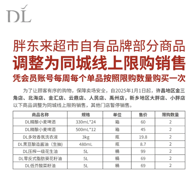 12月31日,胖东来商贸集团发布公告称,胖东来超市自有品牌部分商品调整为同城线上限购销售,凭会员账号每周每个单品按照限购数量购买一次。根据公告,自2025年1月1日起,许昌地区金三角店、北海店、金汇店、云鼎店、人民店、禹州店,新乡地区大胖店、小胖店DL精酿小麦啤酒等部分商品调整为同城线上限购销售,其他门店暂停销售。恢复线下销售时间将另行公示。