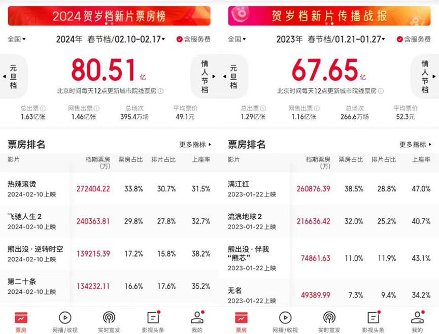 2024年上半年的票房表现其实不差,春节档以80.5亿收官,比2023年(67.65亿)多出了将近13亿。五一档的表现也基本与上一年持平,只可惜暑期档、端午档的连续失手,拉低了全年票房表现。