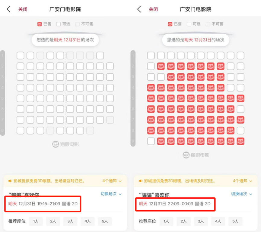 当然,作为这个档期唯一的爱情片,《“骗骗”》还是保留了特殊场——12月31日即上映首日的零点场为烟花跨年场。「定焦One」对比了北京丰台、朝阳、海淀等区的多家影院发现,上映当日,22点“跨年场”的售票情况要远远优于当日其他场次。