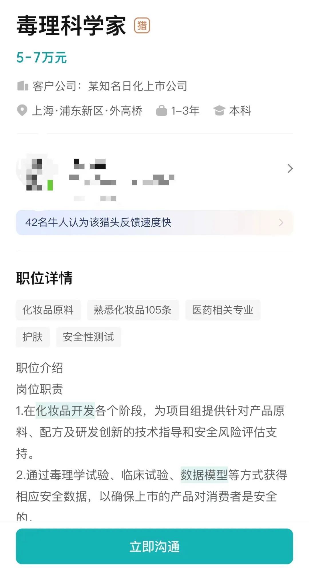 近日,根据某知名招聘网站显示,有猎头为某知名日化上市公司发布毒理科学家岗位,岗位薪资为5-7万元,要求“熟悉化妆品105条”,“医学相关专业”,这意味着该岗位年薪最高达84万元。