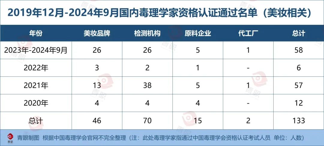 而据青眼梳理,2019年12月-2024年9月,通过中国毒理学会毒理学家资格认证考试人数为422人(包含再认证名单),其中46人任职于美妆品牌企业,70人任职于具有化妆品检测项目的检测机构,15人就职于具有化妆品原料业务的原料企业,总数高达133人,占同期通过人员的31.5%,增长十分迅猛。