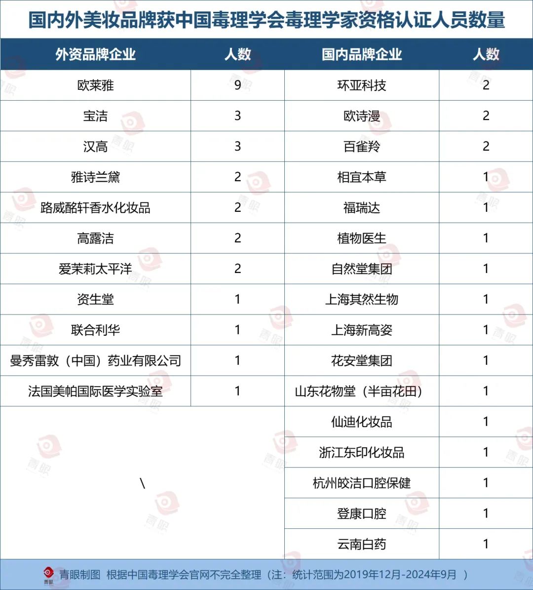 不过,从总数来看,与国际美妆巨头相比,国内美妆企业毒理人才数量仍差距较大。据青眼统计,2019年12月-2024年9月,国内美妆品牌通过中国毒理学会毒理学家资格认证考试人数为19人,而据欧莱雅官网披露,欧莱雅共有114位致力于产品安全的毒理学家。