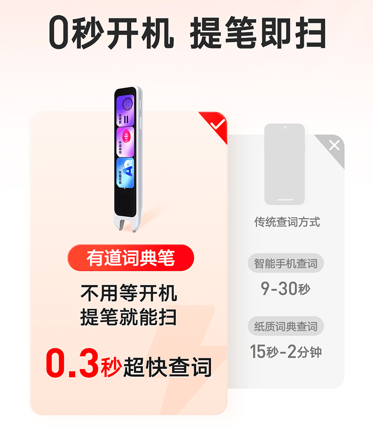 在这个快节奏的时代,更高的效率意味着更好的成绩。有道词典笔A7 Pro打破了传统词典笔开机后使用的模式,实现了0秒开机、提笔即扫,让学生在使用过程中完全不需要等待,极大地提升了学习流畅度和连贯性。尤其是对于年龄较小、低年级的孩子来说,即使是数秒的开机启动时间,都容易消耗掉孩子的耐心,从而走神分心。因此,A7 Pro作为专为语言学习设计的学习工具,首先抓住了用户群体的核心痛点进行升级迭代,一方面充分呵护低年级孩子的学习专注力,辅助他们养成良好的学习习惯。