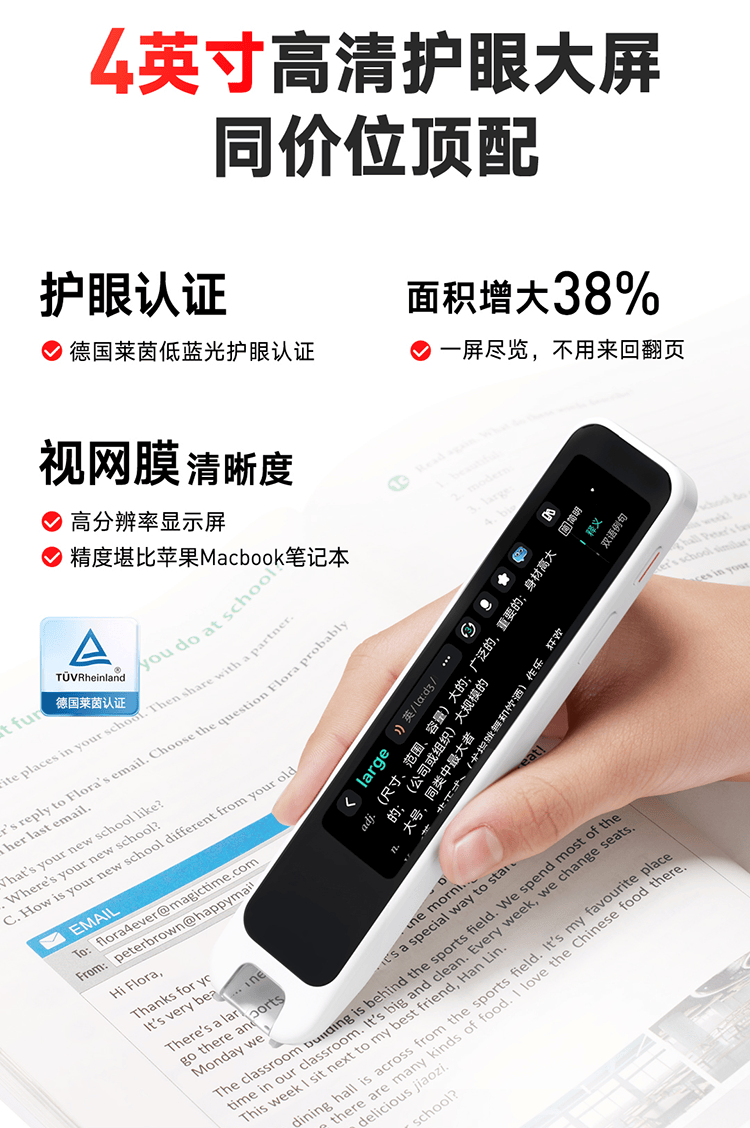 在“更大”的维度上,有道词典笔A7 Pro不仅拥有4英寸护眼大屏,采用德国莱茵低蓝光认证技术,能够在长时间使用的同时,有效保护孩子的视力健康;同时,A7 Pro配置了4200万超大词库,重点覆盖《牛津高阶英汉双解词典》《现代汉语规范》《古汉语词典》等正版权威词典,将最有用的内容精选给孩子,而不是一味堆砌无用词典反而造成负担。