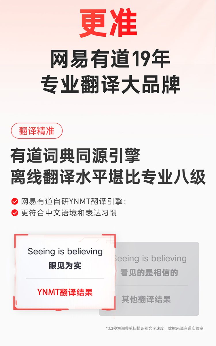 有道词典笔A7 Pro的“更准”则体现在其翻译专业度上。孩子学外语,耳濡目染的内容是否准确很关键,但市面上五花八门的翻译产品,常常让家长无从下手。那么,有道词典笔依托网易有道19年的专业翻译积淀,无疑给家长提供了一个省时省心的首选!A7 Pro搭载了有道自研的YNMT神经网络翻译引擎,能提供堪比专业八级的翻译内容,这意味着孩子们无论何时何地遇到生词难题,A7 Pro都能提供准确、地道的翻译支持,帮助他们克服外语学习障碍。