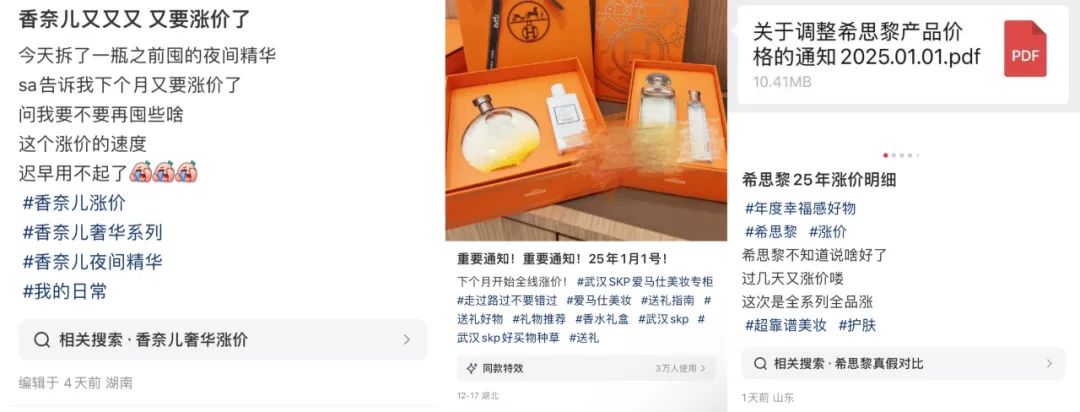 从小红书等社交平台上相关的贴文信息来看,有不少网友表示,“香奈儿柜姐发我微信,说会涨价”、“香奈儿彩妆线2025年初涨价”、“奢华系列会涨很多”。