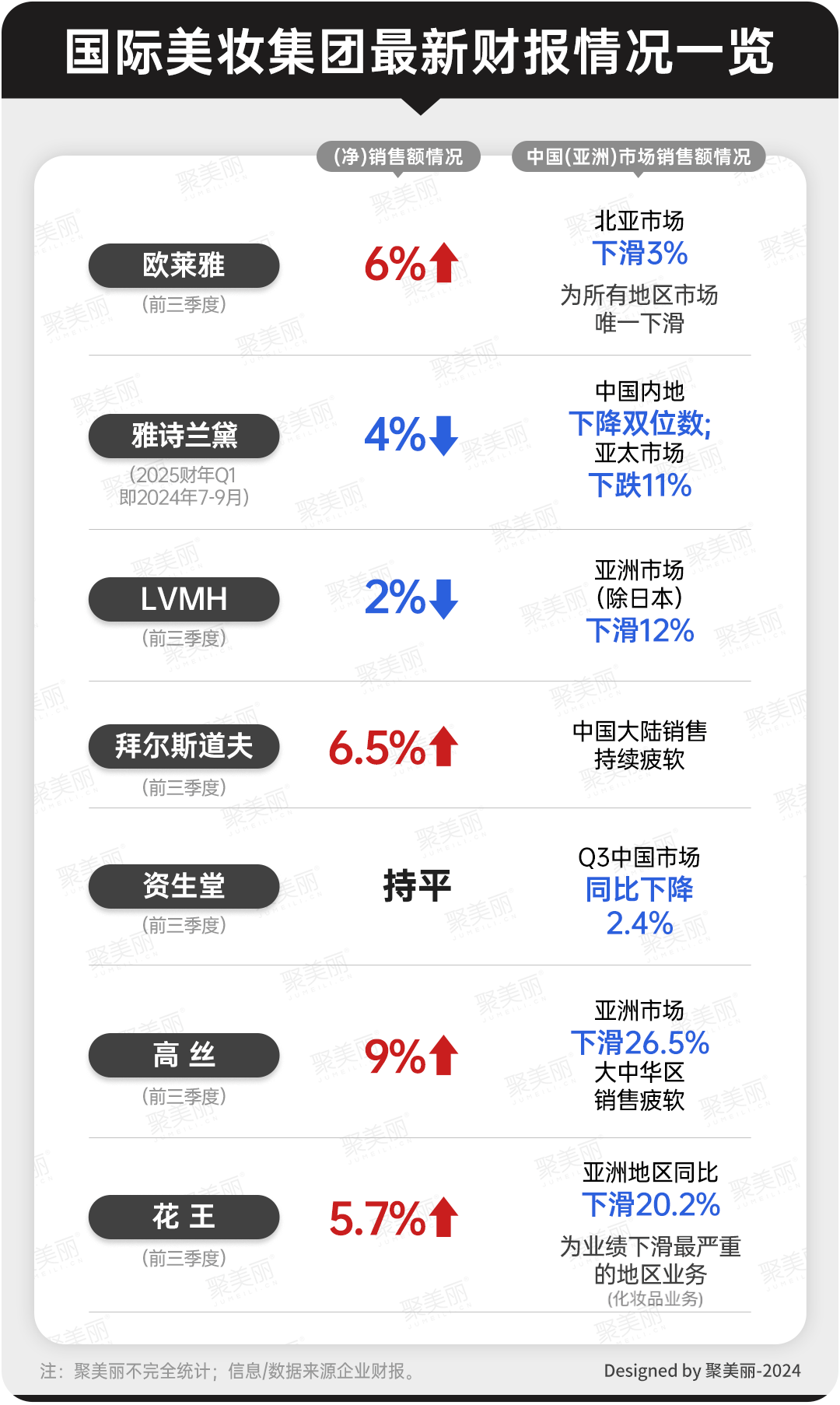 其中,雅诗兰黛2024财年(2023年7月-2024年6月)净销售额同比下滑2%;营业利润同比暴跌31%;资生堂集团2024年前三季度销售额虽与去年同期相持平;但核心营业利润同比下滑26%;营业利润更是下跌92%。