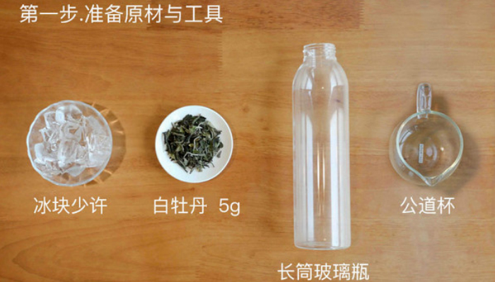 第一步:准备原材和工具。白牡丹5g、冰块少许、长筒玻璃瓶1个、公道杯1个、适量的开水。