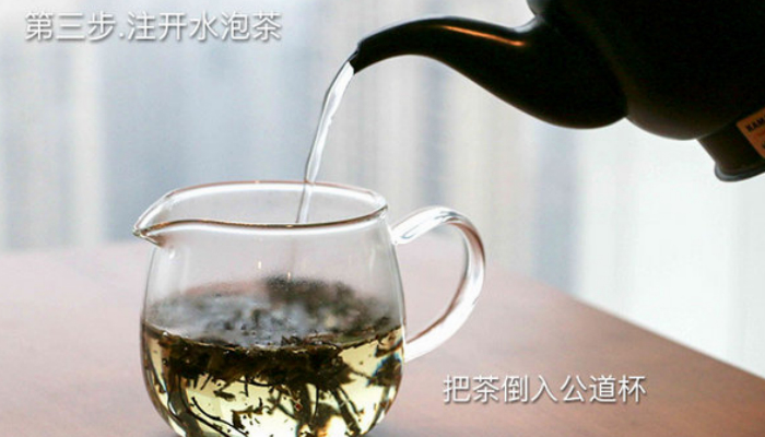 第三步:将开水注入容器的1/3,等茶叶泡开后,在继续加热水到容量的8分即可。