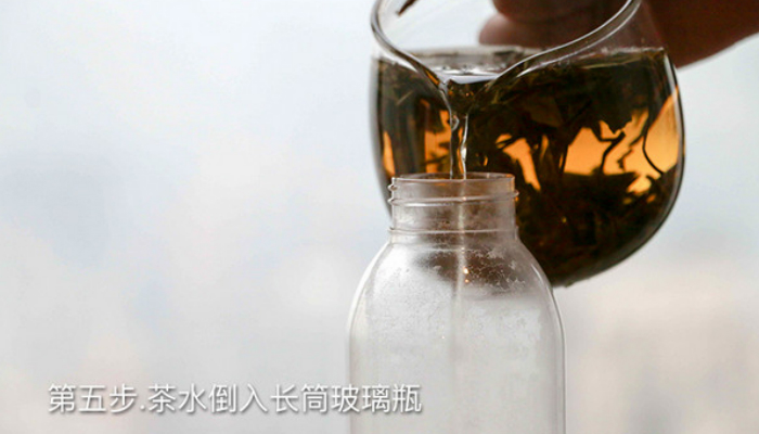 第五步:如果你想着能随身携带着喝,那可能就需要这一步了。将茶水滤出倒入长筒玻璃瓶。
