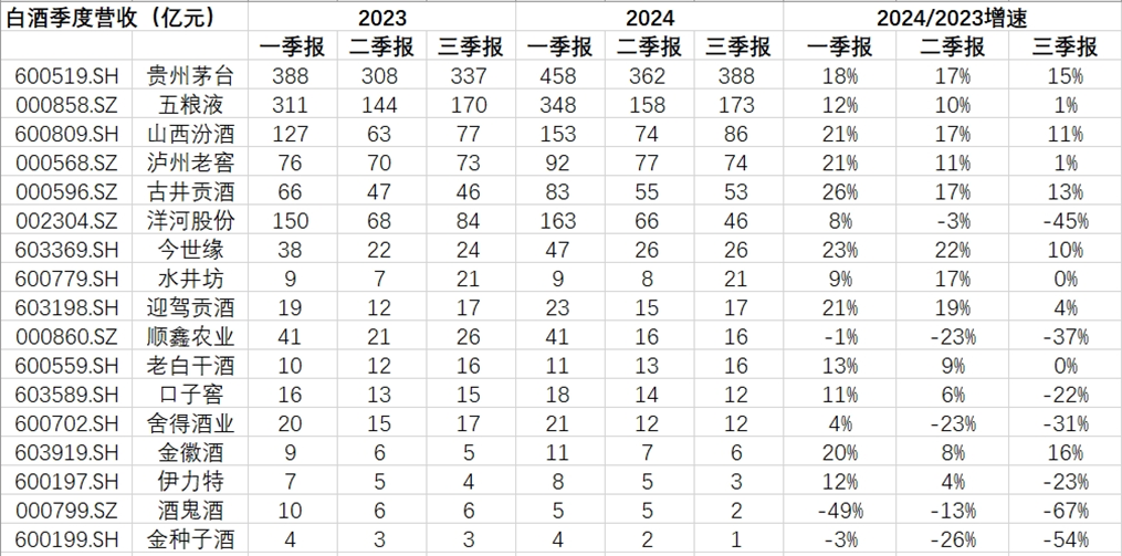 从2024年至今各家白酒公司业绩增长看,第一季度行业整体表现良好,超过春节前市场的预期,股票市场也给与了乐观反应。但二季度之后,终端真实动销开始减弱。泸州老窖(000568.SZ)、古井贡酒(000596.SZ)和洋河股份(002304.SZ),相对一季度开始减速,三季度则更普遍进一步减速。
