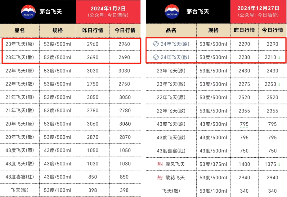 根据公众号今日酒价市场批价,2024年初飞天茅台批价整箱2960元/瓶、散瓶2690元/瓶;到了12月27日,整箱下降到2290元/瓶、散瓶2210/瓶。