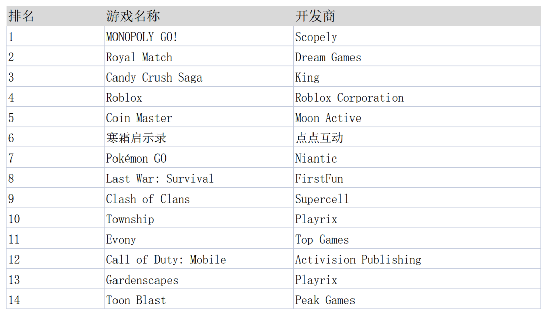 图:2024年H1美国手游内购收入榜,数据来源点点数据