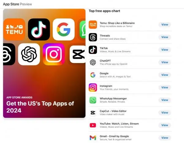 临近年底,苹果又发布了App store的年度榜单。前四名里,有三个都与马斯克有关:第四名的ChatGPT,马斯克曾是它的联合创始人之一,同时ChatGPT也是xAI最大的竞争对手。第三名的Tiktok,是马斯克直接发文支持的对象,他在2024年4月旗帜鲜明地反对有关它的禁令。第二名的Threads某种程度上就是马斯克创造的——正是由于马斯克对推特的巨大改变,才有了用户和广告主的流失,Meta恰逢其时地推出了Threads。