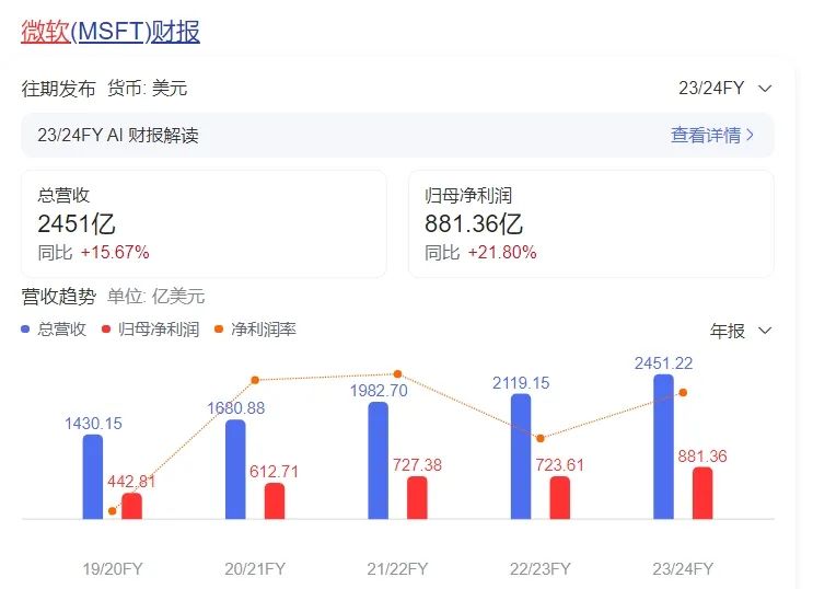 但硅谷也的确有很多互联网科技公司通过AI赚到了大钱。抛开卖铲人英伟达不谈,微软在2024财年的总营收达到了2451亿美元,同比增长高达16%,净利润同比增长22%。