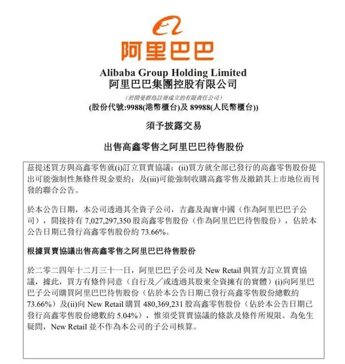 实际上,早在年初,市场上就频繁传出阿里考虑出售高鑫零售的消息。2024 年 10 月,高鑫零售称接获一名有意要约人发出的接触函,有媒体消息称潜在收购方是高瓴资本,如今证实是德弘资本。
