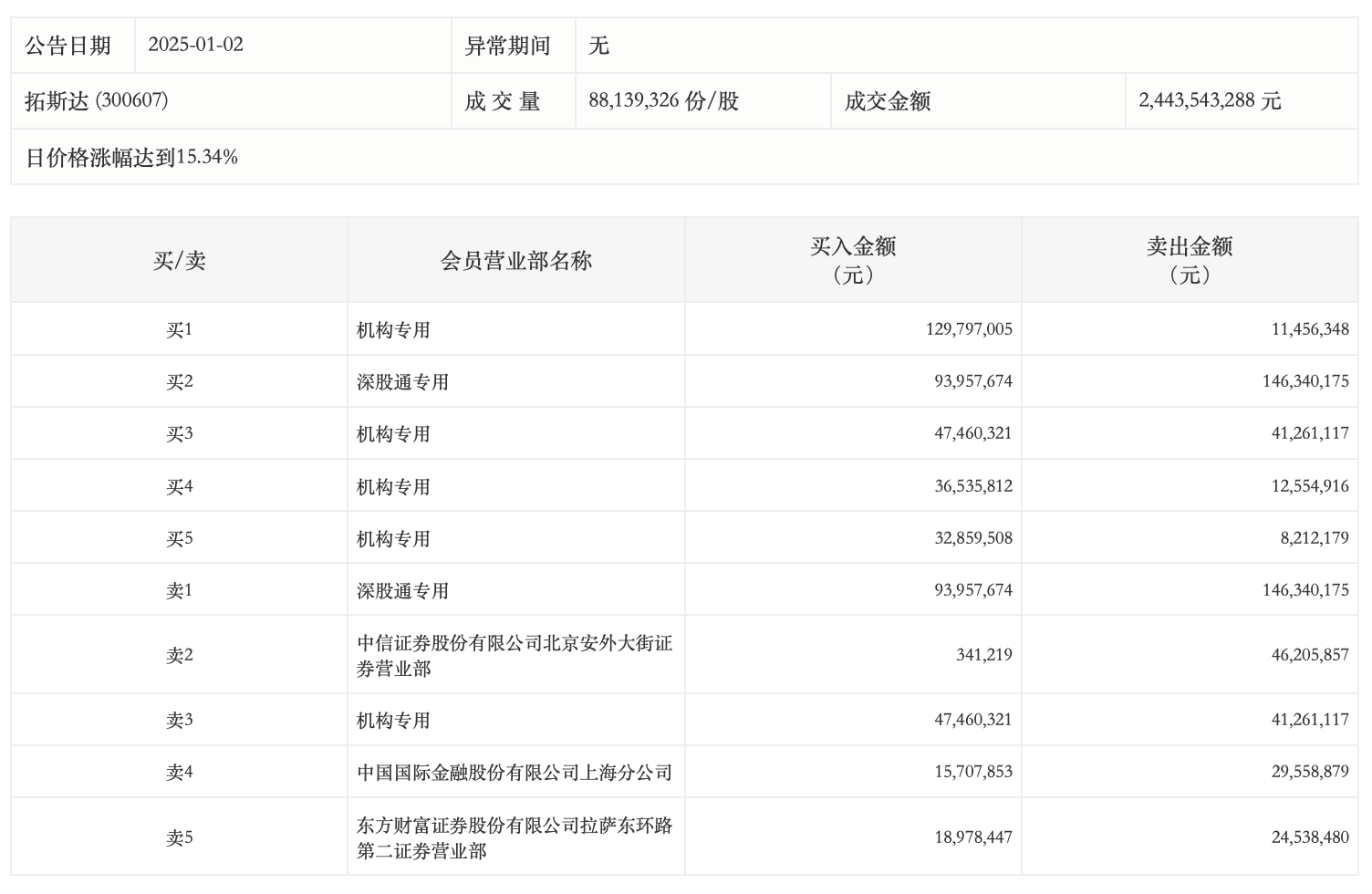 1月2日,拓斯达今日涨15.34%,成交额24.44亿元,换手率26.10%,盘后龙虎榜数据显示,深股通专用席位买入9395.77万元并卖出1.46亿元,4家机构专用席位净买入1.73亿元。