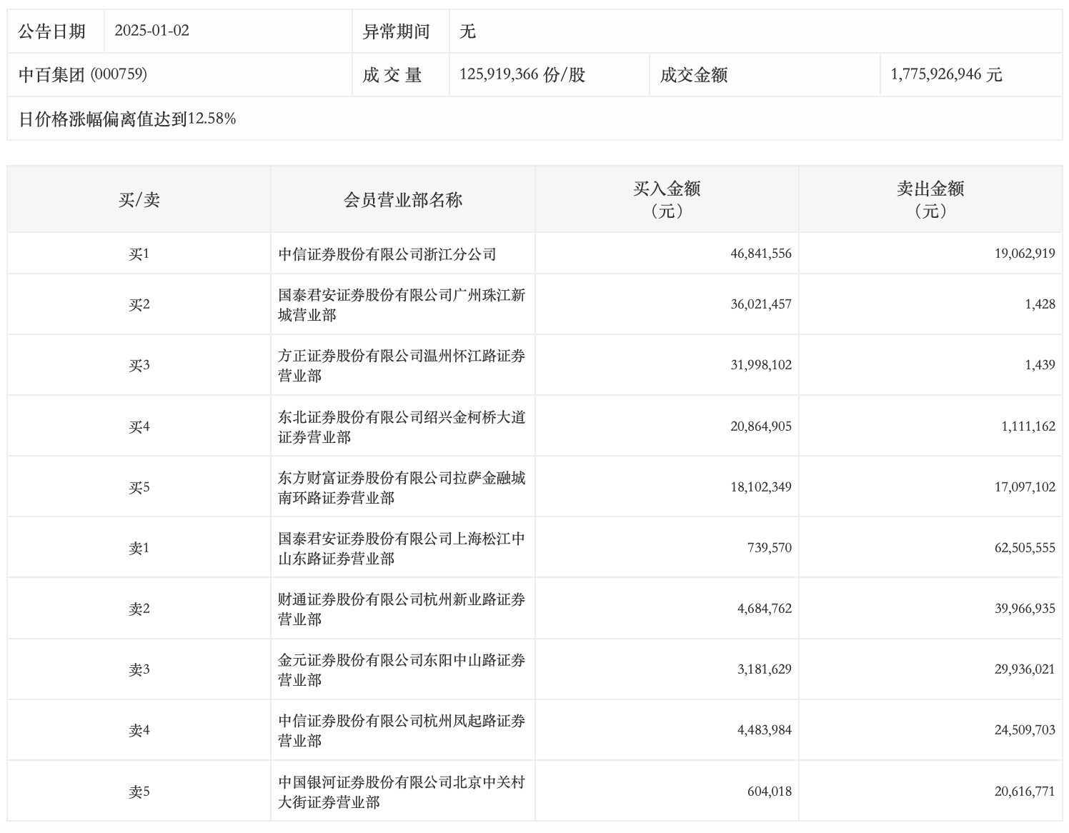 1月2日,中百集团今日涨停,龙虎榜数据显示,上榜营业部席位全天成交3.82亿元,占当日总成交金额比例为21.53%。其中,买入金额为1.68亿元,卖出金额为2.15亿元,合计净卖出4728.67万元。