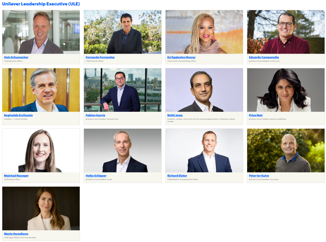 今天,小食代翻看联合利华全球官网看到,领导执行委员会也已显示为全新阵容。随着这一波新任命生效,联合利华领导执行委员会名单与司马翰去年上任前相比已“大洗牌”。