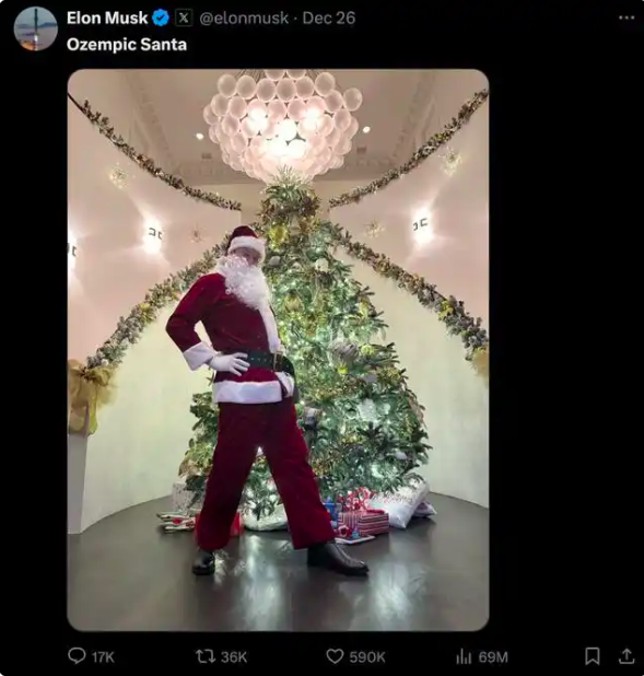 近日,马斯克在社交平台发布了一张打扮成圣诞老人的照片,或许是想炫耀瘦身成果,照片中他站在一棵圣诞树前,并配文“OzempicSanta圣诞老人”。Ozempic为一种减肥药物,中文名为“司美格鲁肽”,为医药公司诺和诺德旗下的药物。但在评论区,马斯克又表示自己实际使用的是Mounjaro——即礼来的替尔泊肽。