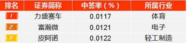 一季度,A股新股发行规模进一步提速,共计134只新股上市,募集资金696.04亿元。体育板块方面,共有牧高笛与力盛赛车两只新股核发上市,总共募集资金4.4亿。新股发行提速,中签却越来越难。在今年迄今为止中签率最低的10只新股,力盛赛车0.0117%的中签率位列第一位。