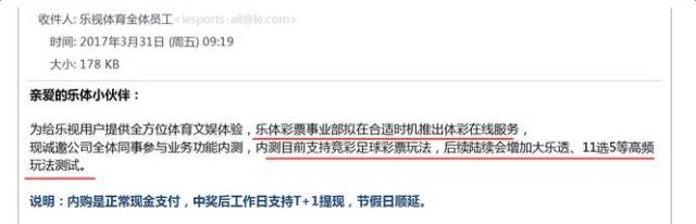3月30日,乐视网向嘉睿汇鑫协议转让部分股票完成。3月31日,乐视网内部有消息传出:乐视体育彩票事业部拟在合适时机推出体彩在线服务,目前已上线内测版本,包含竞彩足彩玩法,未来还将上线大乐透、11选5等高频玩法。