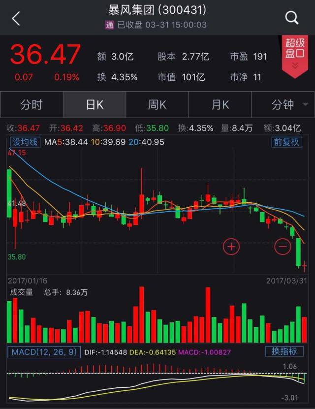 受净利下滑影响,年报发布后,暴风集团股价在接下来几日内大跌。2015年3月暴风集团在创业板上市,曾以28个涨停板达到148元/股的高价,如今则长期在40元左右徘徊。