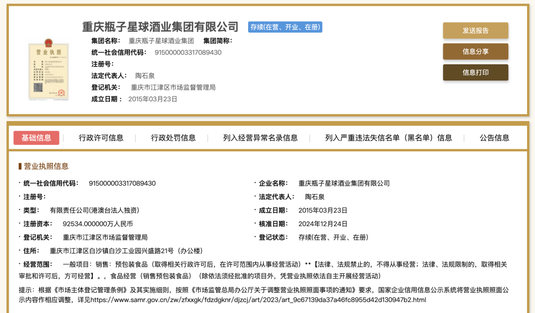 近日,国家企业信用信息公示系统披露,“江小白”品牌母公司完成工商登记变更,公司名称从“重庆江小白酒业有限公司”更改为“重庆瓶子星球酒业集团有限公司”。据公开信息显示,该公司已成功注册多枚“瓶子星球”商标。