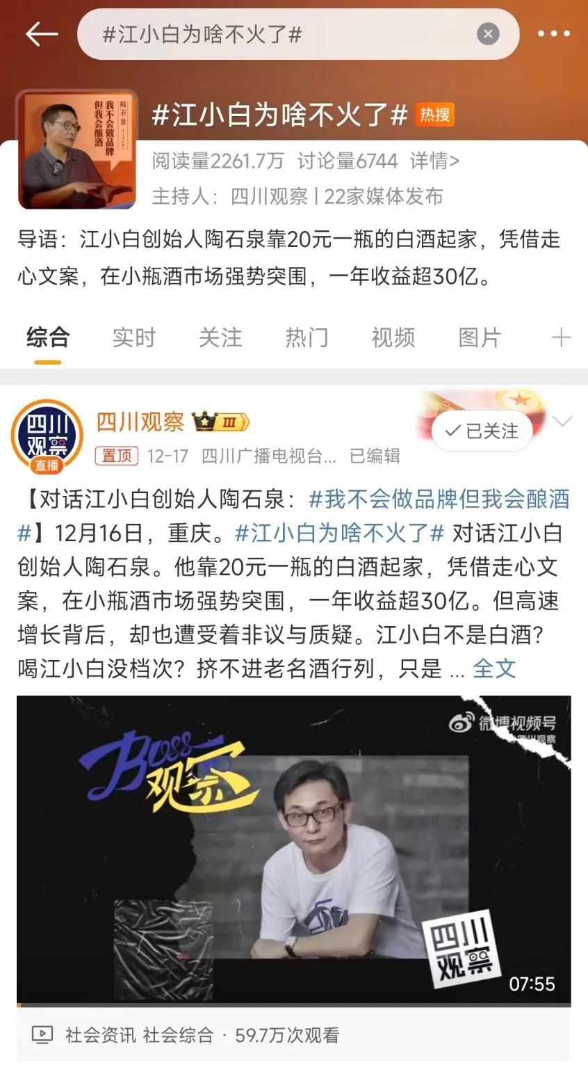 近日,新式白酒江小白再次引发舆论热议。先是“江小白为啥不火了”话题冲上微博热搜第五名,不少网友积极起来,在评论里帮江小白“出谋划策”。随后江小白携新名字“瓶子星球”现身,吸引了一波热度。