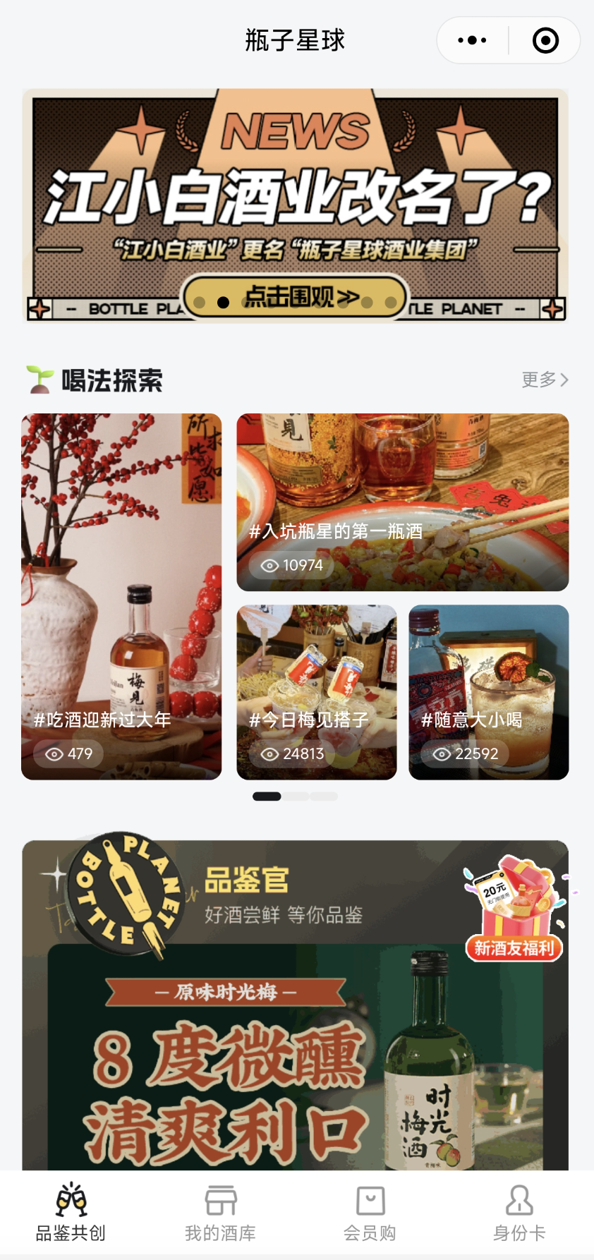 其中,“瓶子星球”IP互动量最大的平台应属小程序,该小程序成立于2020年,除了酒水商城和会员体系,主打“酒话”和“酒友说”社区,强调酒友交流与品鉴共创。在瓶子星球小程序上,通过参与话题抽奖、领取折扣优惠等手段,用户可以UGC形式,分享饮酒体验和个性化内容,形成了具有互动性和归属感的线上社群。