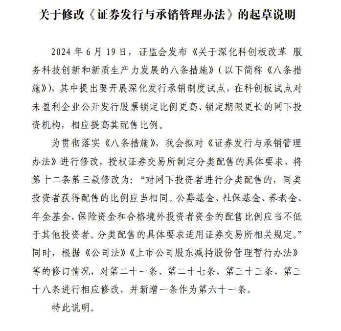 为贯彻落实《八条措施》,证监会拟对《证券发行与承销管理办法》进行修改,授权证券交易所制定分类配售的具体要求。同时,根据《公司法》《上市公司股东减持股份管理暂行办法》等的修订情况,对涉及条款相应修改。现向社会公开征求意见。