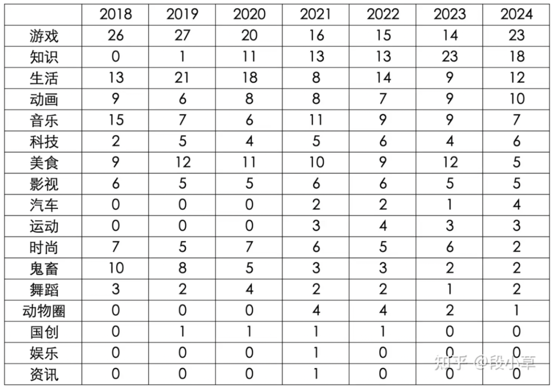 因此,B站近几年来不仅没有向碎片化、快餐化方向倾斜,反而在不断扶持知识区高质量内容,从每年的百大UP主名单就能明显看出这一趋势。有网友统计了2018年至今每年百大UP的分区情况,发现知识区从0崛起,自2021年开始一直稳居前两名。这也是为何抖音、快手纷纷发力泛知识内容,却并未对B站造成冲击——虽然开疆拓土动作迟缓,但B站没有忘记加固护城河。