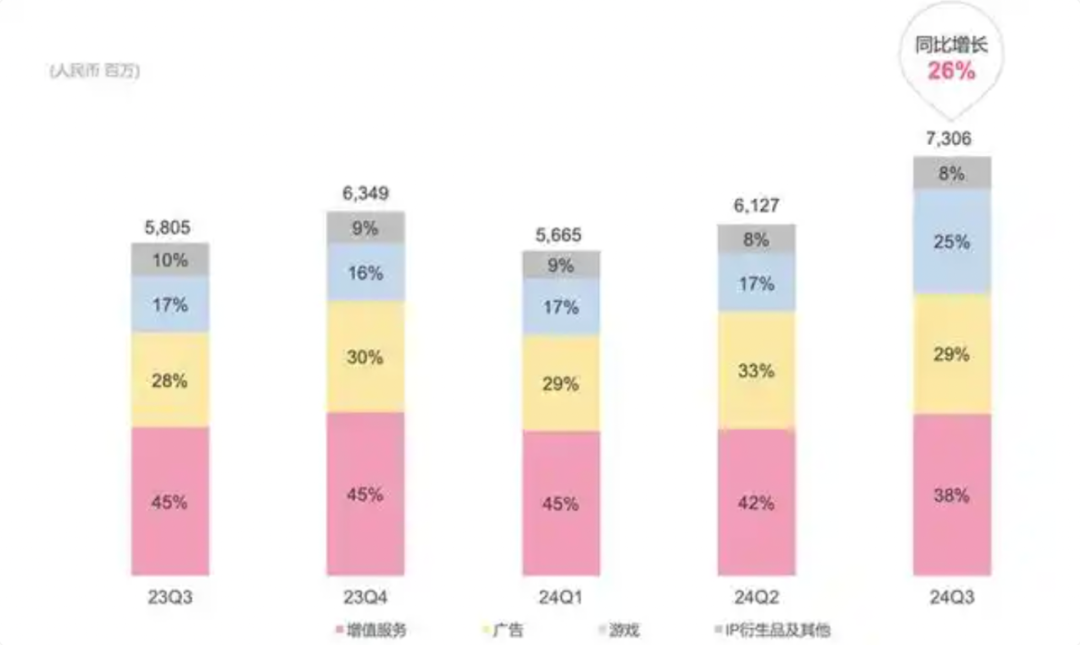 当管理层接受了无法成为下一个抖快的现实,在不伤及社区氛围的基础上全力冲刺商业化,也就成了B站当前的主要任务。从2024年三季度财报来看,B站的营收结构正在变得更加健康,增值服务、广告、游戏、IP衍生品及其他四大业务板块,分别贡献了收入的38%、29%、25%和8%,除了电商业务仍未有所起色之外,其他几块都实现了均衡增长,虽然比不上内循环驱动增长的抖音、快手,但比依赖会员收入的长视频平台更加可持续。