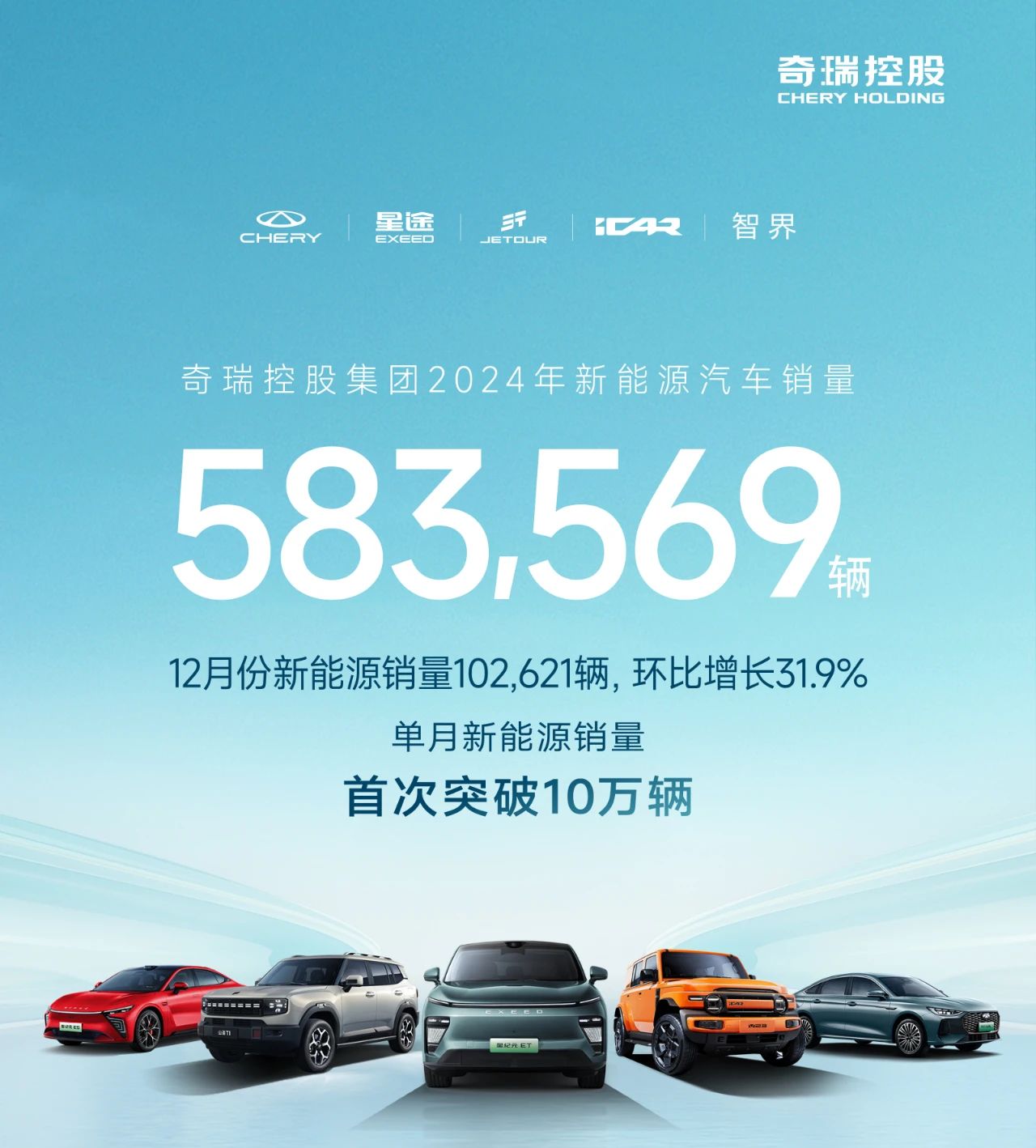 值得一提的是奇瑞集团新能源销量节节攀升,自2024年3月份以来实现新能源销量“十连涨”,其中,12月份新能源销量102,621辆,环比增长31.9%,单月新能源销量首次突破10万辆,年度新能源销量583,569辆,同比增长232.7%,增速位居主流车企首位。