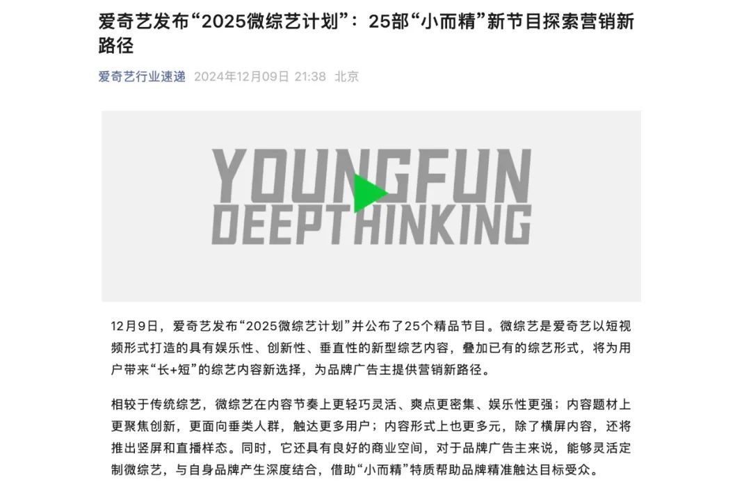 事实上,如今微综艺之所以备受平台重视,头号原因就是,它指引了行业摸索综艺变现新路径的前沿方向。例如说,在爱奇艺行业速递官微发布的「2025微综艺计划」介绍里,“为品牌广告主提供营销新路径”、“借助‘小而精’特质帮助品牌精准触达目标受众”等商业化愿景就是该计划的重中之重。
