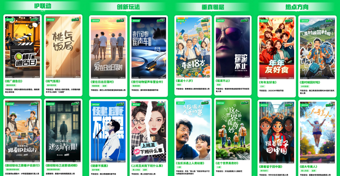 在内容玩法超前的「IP联动」板块,桃厂此次首创了播前探班(如《桃厂通告日》)、播中陪伴(如《桃气饭局》)、播后联动(如《剧综联动之喜剧星工场》)等多维延展IP价值的剧综创制新法;而在内容先锋性很强的「创新玩法」板块,《爱在日出日落时》聚焦代际恋爱互助、《夜行动物留声车营业中》主打深夜故事分享、《上班丑关我下班什么事》把短视频素人改造移植到长内容,这些尝试都将给2025的综艺观众带去兼具新鲜感、独特感的观综体验。