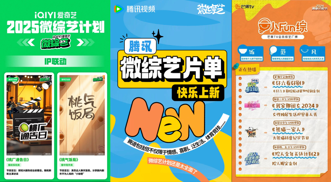 要知道,去年无论是芒果用小半年试验小而美会员定制内容的「小Fun综」,还是临近年底腾讯视频于11月突携5档新节目发力「微综艺计划」,抑或爱奇艺于不久前公布了下辖25个精品节目的「2025微综艺计划」,这些新动作都可被视为各平台从内容、商业化两个维度探路小而美综艺“新活法”的先锋尝试。
