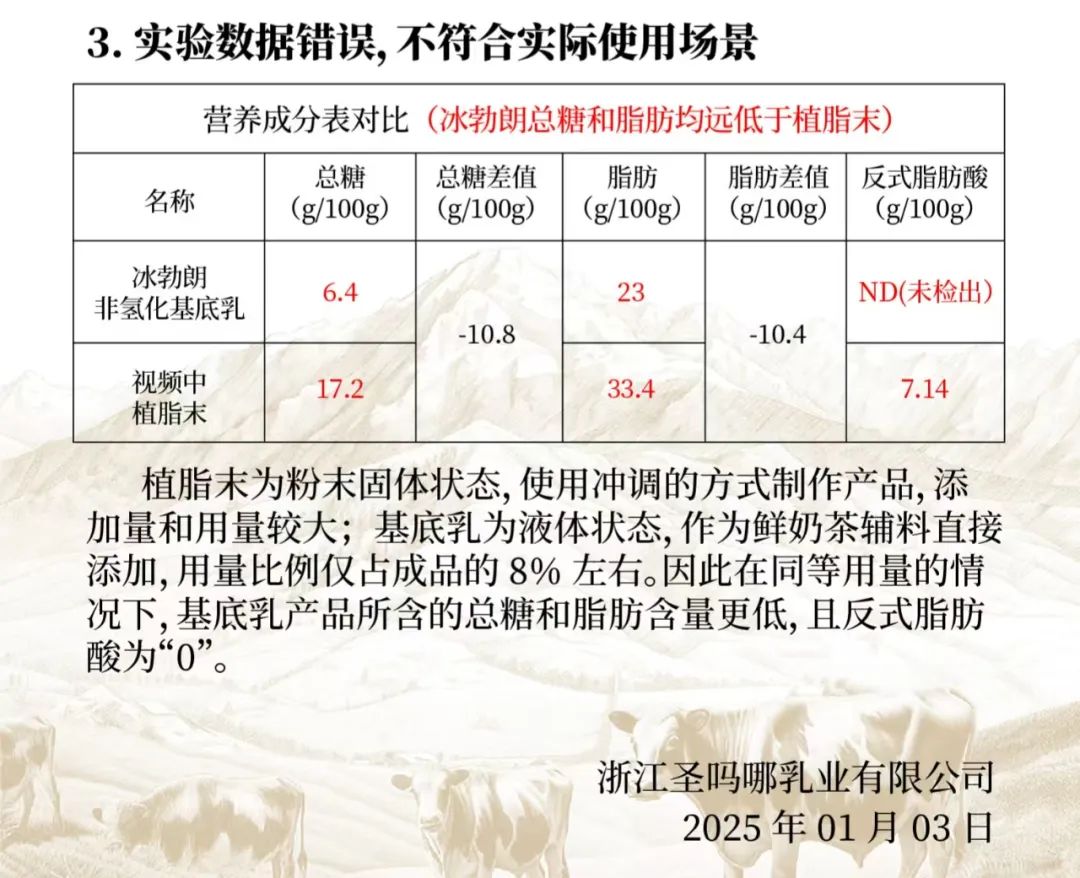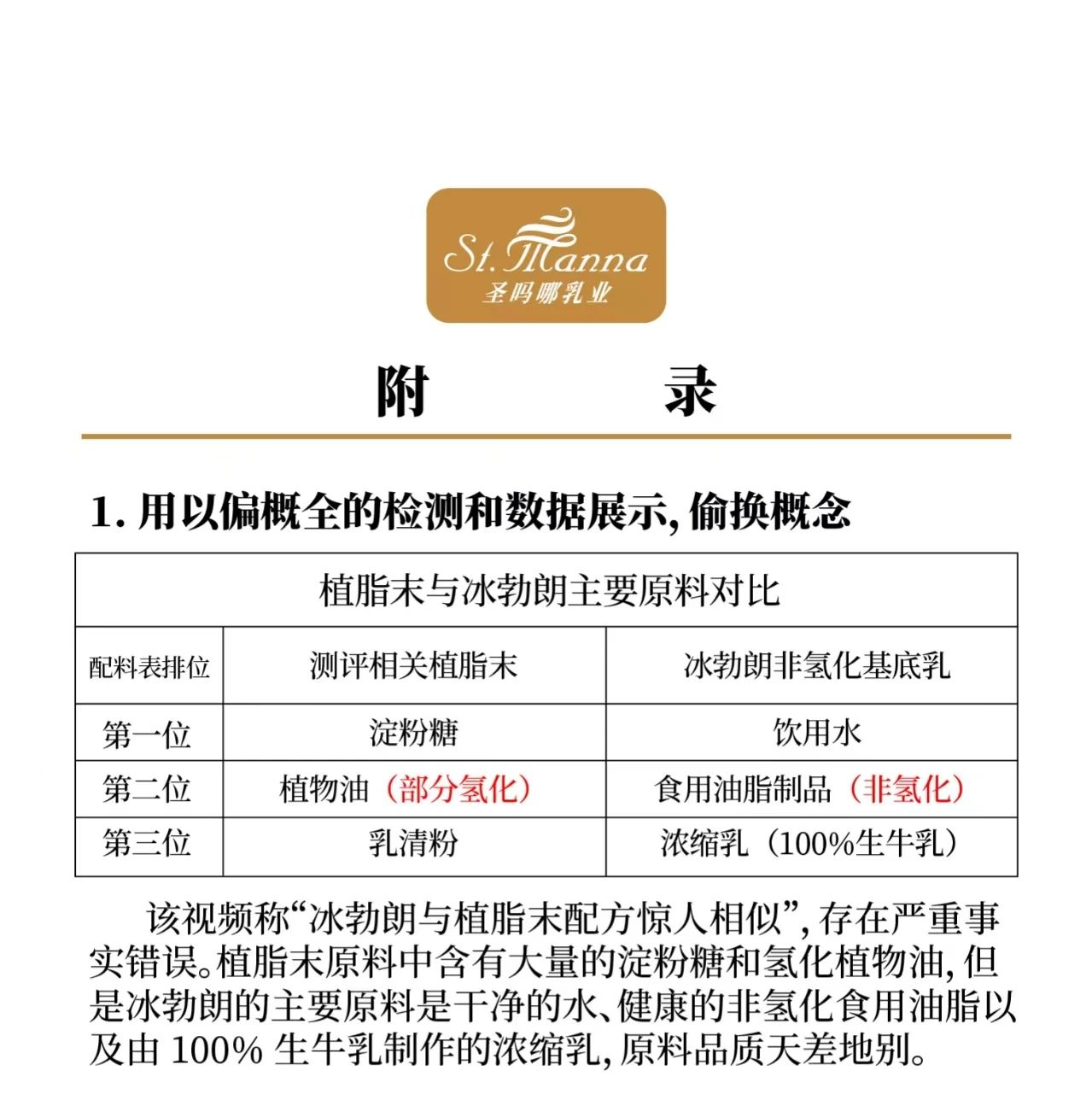 视频中称,冰勃朗成分与植脂末相似,因此冰勃朗是一种“科技乳”。对这一结果,冰勃朗生产厂商浙江圣吗哪乳业有限公司发文回应,冰勃朗和植脂末的原料本质上有明显差别。