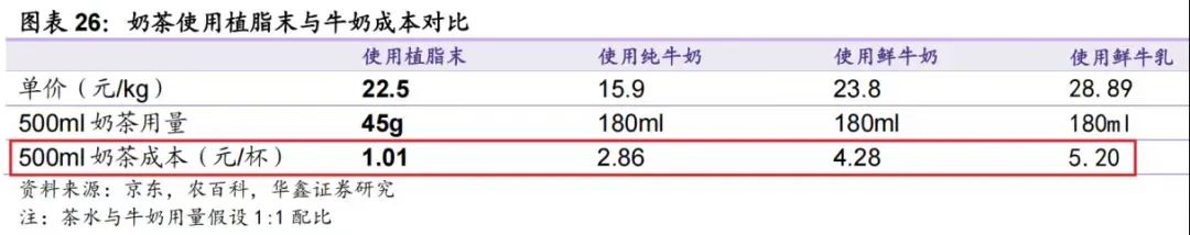 忽略掉茶底和糖等共有的相同成本。按照这个比例制作一杯500ml的奶茶,需要40ml冰勃朗,约1.5元(30元/1L);95ml牛乳,约2.75元(29/1L),总成本约4.25元。如果全部采用牛奶或者牛乳,根据华鑫证券的测算成本在4.28-5.20元之间。