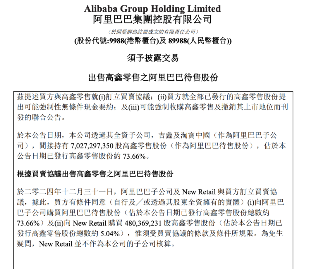 这是一场意料之中的出售。2024年9月,高鑫零售停牌,市场上关于阿里出售高鑫零售的传言不断。次月,高鑫零售发布公告称有买家有收购意向。