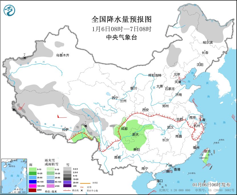 中央气象台最新预报,受冷空气影响,预计1月6日夜间至9日,我国大部地区将陆续出现降温,局地降温幅度超过8℃,北方部分地区还将伴有大风天气,青藏高原东部、西南地区和江南西部等地有一次雨雪天气过程。其中,四川、云南、贵州、重庆、湖北、湖南的部分地区有望见到降雪,局地有冻雨,主要雨雪时段在8日。