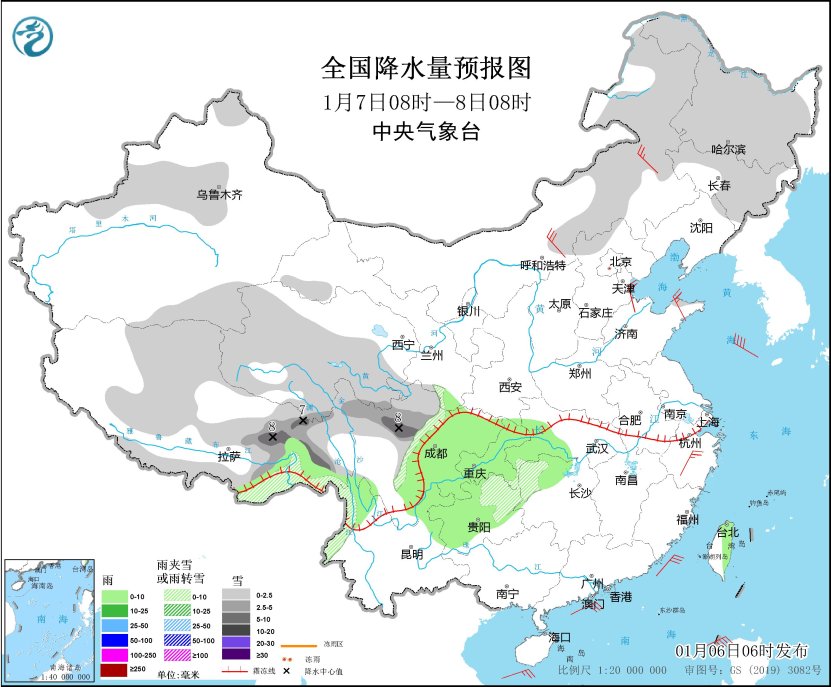 8日,四川南部、云南西北部和东北部、贵州中北部、重庆东南部、湖北西南部、湖南西北部等地的部分地区有中到大雪,局地暴雪,贵州中北部、四川南部、湖南西部等局地有冻雨。