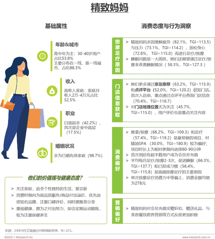 精致妈妈群体,重视品质,关注养生,青睐较长时间的按摩足疗来改善睡眠、保健养生