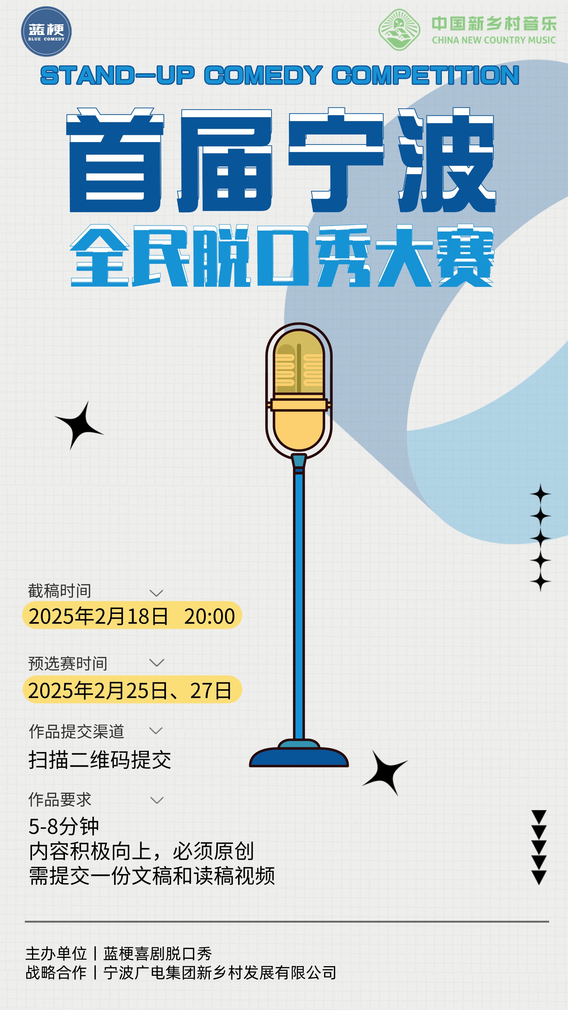 借此机会,为丰富宁波市民的文化生活,发掘和培养本地的脱口秀人才,宁波广电集团新乡村音乐发展有限公司与蓝梗喜剧携手推出首届宁波全民脱口秀大赛。这次大赛不仅给宁波市民提供了一个展示才艺和分享幽默的舞台,也让更广泛的群体能够体验到脱口秀艺术的魅力。借助这个平台,期望能发掘并扶持一些有潜力的新星,帮助他们走向更广阔的舞台。