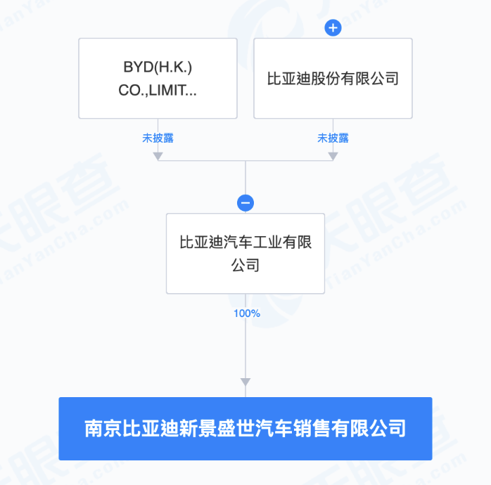天眼查APP显示,近日,南京比亚迪新景盛世汽车销售有限公司成立,法定代表人为刘道阳,注册资本200万元,经营范围含新能源汽车整车销售、新能源汽车电附件销售、充电桩销售、二手车经纪等。天眼查股权穿透显示,该公司由比亚迪汽车工业有限公司全资持股。