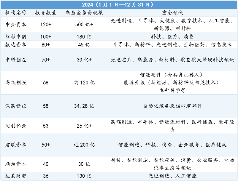 这些机构大多有着共同的特性:大白马、良好的募资基础,以及强而有力的品牌和经过周期考验的业绩。除了投资数量较多,这些机构均在2024完成了新基金的募资,并有稳定的IPO输出。