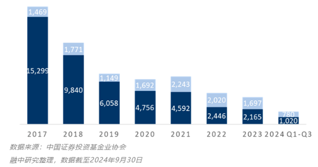 2024年,中国私募股权市场的募资情况下滑明显,2024年前三季度新增基金数量、规模均较去年同期大幅下降。
