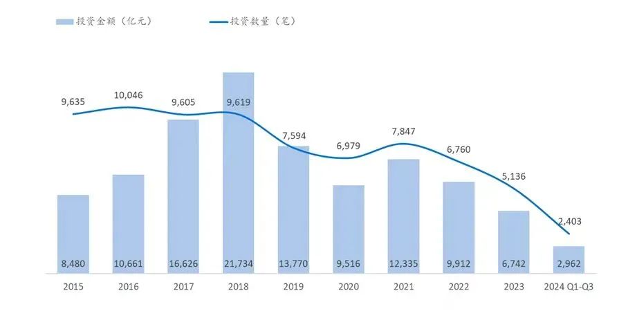 根据融中数据统计,2024年前三季度合计投资规模为2,962.46亿元,同比下降了37.69%;合计投资数量为2,403笔,同比下降了30.15%。