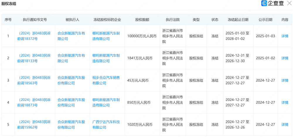 根据企查查上的消息,2025年1月3日,合众新能源汽车有限公司新增一条股权冻结信息,股权被执行的企业为哪吒新能源汽车制造有限公司,冻结股权数额10亿人民币,冻结期限自2025年1月3日至2028年1月2日,执行法院为浙江省嘉兴市桐乡市人民法院。