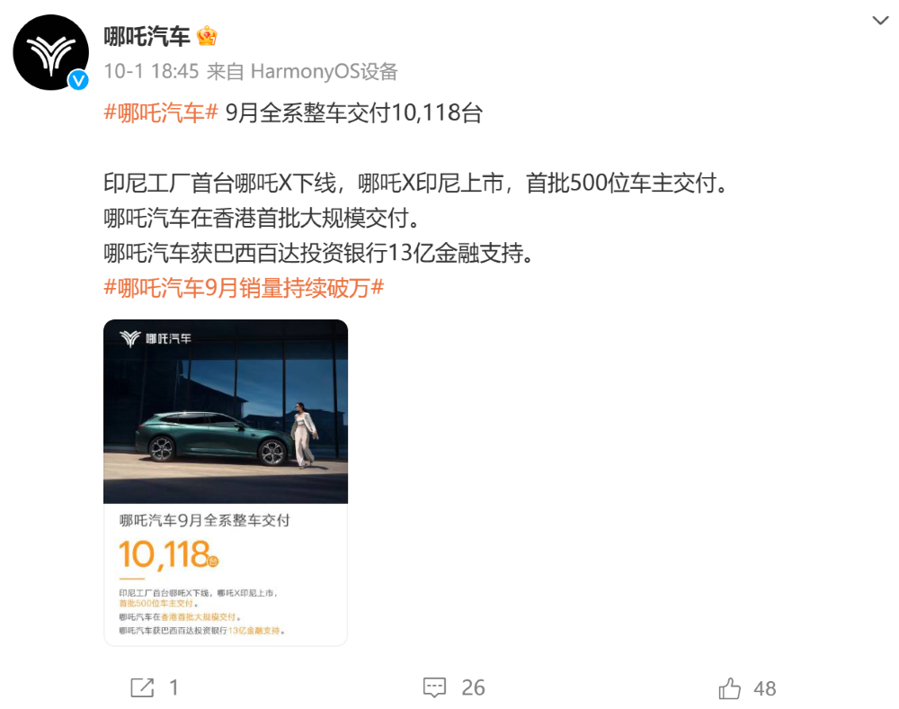 但是在2024年,根据哪吒汽车发布数据显示,哪吒汽车9月全系整车交付10118辆,与8月交付的11005辆相比略有下滑。